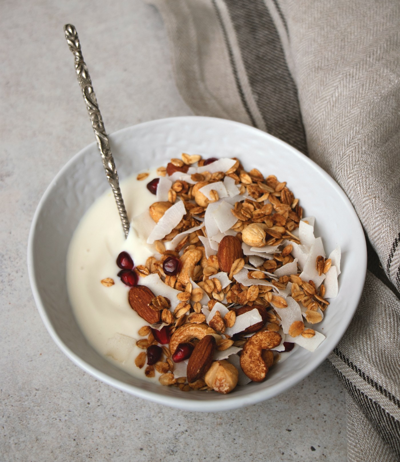 Le granola est un mélange de céréales (souvent de l’avoine), d’oléagineux (amandes, noisettes, noix… ), de graines (graines de courge, tournesol…) et potentiellement de fruits secs (raisins secs, cranberries..). En fait, il n’y a pas de recette prédéterminée, juste une base. L’idée est ensuite de personnaliser en fonction de vos goûts !